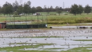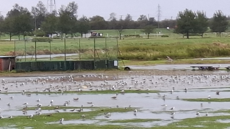 雨上がりの河川の野球場。無数のカモメたちによる鉄壁の守備 (*^^*)